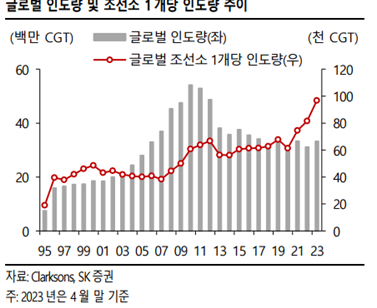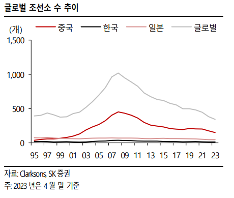 그런데, 아래 차트를 보면 이런 문제는 매우 많이 개선되었다는 점을 알 수 있습니다. 글로벌 조선소 숫자는 1999년 수준으로 보이며, 실제로 글로벌 조선소 1개당 인도량이 늘어나는 효과로 이어지고 있다는 점을 알 수 있습니다.