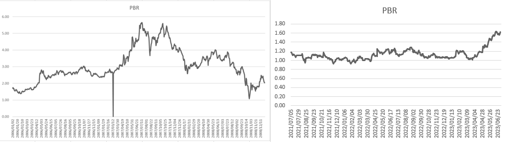 이처럼 과거 PBR-ROE 사례에 비추어 보면 PBR은 2배에서 6배까지 올라가고, ROE는 적어도 10% 까지 올라가고 나서야 주가가 고점을 친다는 것을 알 수 있습니다(ROE는 그 이후로도 높아지지만, 주가는 빠짐).