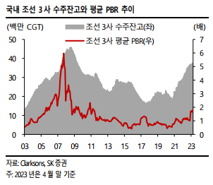 일반적으로 사용되는 밸류에이션 기법 외에도, 발주 산업이라는 조선주 특성상 수주잔고 대비 PBR을 대비해보는 것도 유의마하다고 생각됩니다.