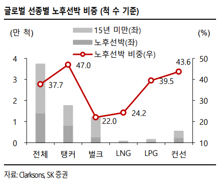 아래 차트를 보면 글로벌 노후선박 비중이 37.7%정도입니다. 과거 데이터가 없어서 높은 것인지 아닌지는 알 수 없으나, 적어도 컨테이너선, 탱커 같은 경우에는 상당히 노후선박 비중이 높은 수치일 것으로 생각됩니다.