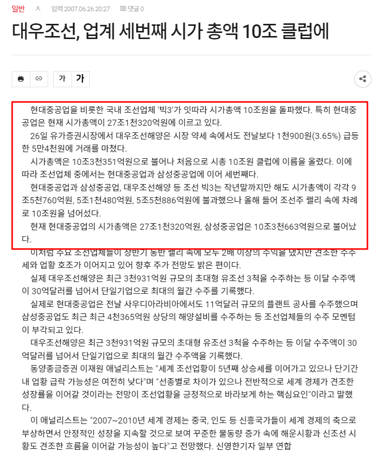 제가 데이터를 얻은 data.krx.co.kr에는 '종가'data는 있는데, 주식수나 시가총액 데이터가 없어서 아쉽게도 시가총액을 대비해보지는 못했습니다. 다만, 2007년 당시 조선주 관련된 기사에서 당시 종목들의 시가총액 데이터는 확인할 수 있었는데요.