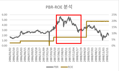 이처럼 과거 PBR-ROE 사례에 비추어 보면 PBR은 2배에서 6배까지 올라가고, ROE는 적어도 10% 까지 올라가고 나서야 주가가 고점을 친다는 것을 알 수 있습니다(ROE는 그 이후로도 높아지지만, 주가는 빠짐).